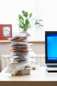200446211-001 March 19, 2014 1 min read Receipts piled on spike beside laptop, on coffee table, close-up